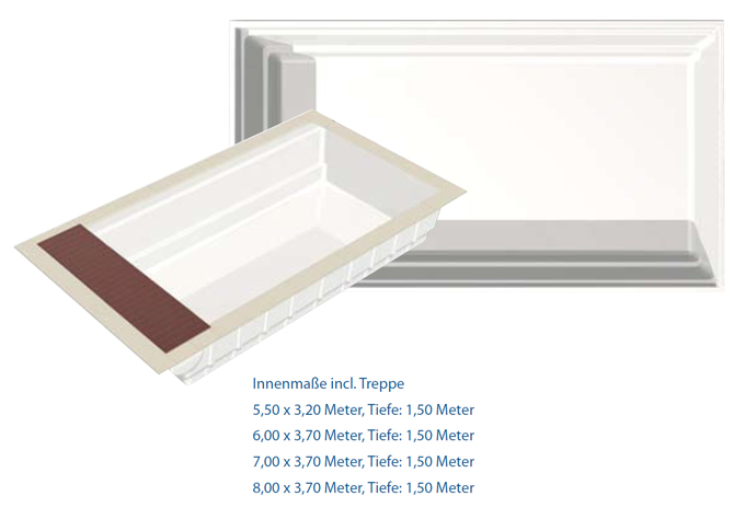 Dieses formschöne Becken verbindet sinnvolle Funktionalität mit ausgesprochener Ästhetik. Die stilvolle Prismaform des Einstiegbereiches macht dieses Becken zu einem echten Blickfang und zum Highlight Ihres Anwesens. Die großzügige Sitz- und Liegestufen kann, mit Sprudel- und Massagedüsen ausgestattet, zu einem entspannenden Wellnesserlebnis werden. Die Anordnung der Treppenanlage ermöglicht die einfache Montage einer Gegenstromschwimmanlage. So bestehen für diesen Beckentyp in der Ausstattung für Ihr Vergnügen keine Grenzen. Eine Rollladenkante und zusätzliche Stehstufe geben dem Becken nicht nur größtmögliche Stabilität sondern bieten höchsten Komfort im gesamten Beckenbereich.
